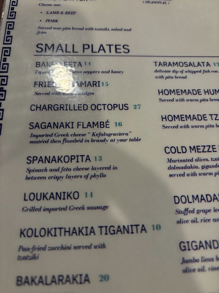 Marinated olives, tzatziki, hummus, dolmadakia, gigandes and feta served with warm pita bread.